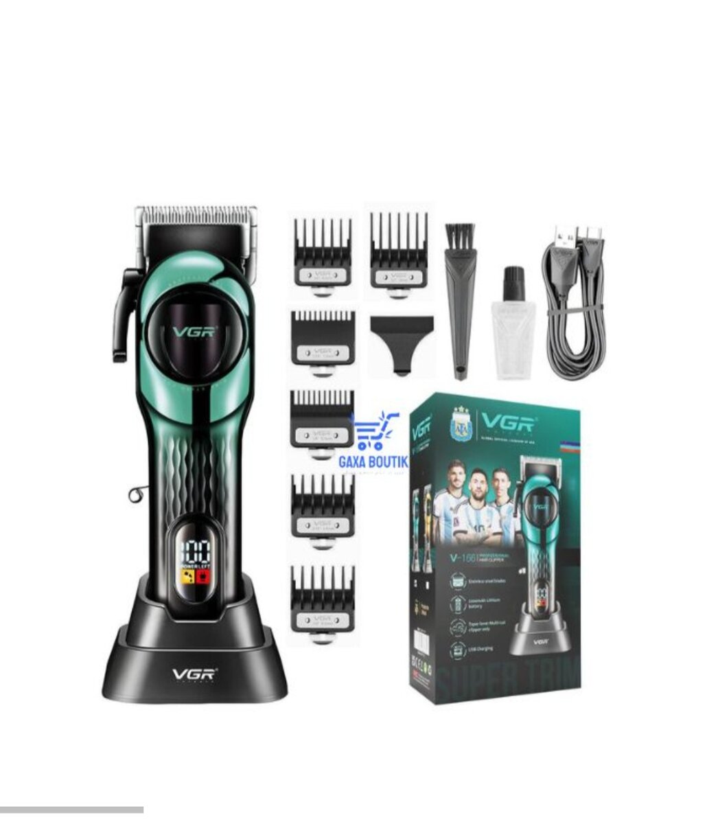 Tondeuse VGR professionnelle pour des coupes précises et stylées. Livrée avec plusieurs accessoires pour ajuster la longueur de coupe, idéale pour les barbiers et les soins personnels. Design ergonomique et batterie longue durée pour un usage facile et efficace. Parfait pour la maison ou le salon.