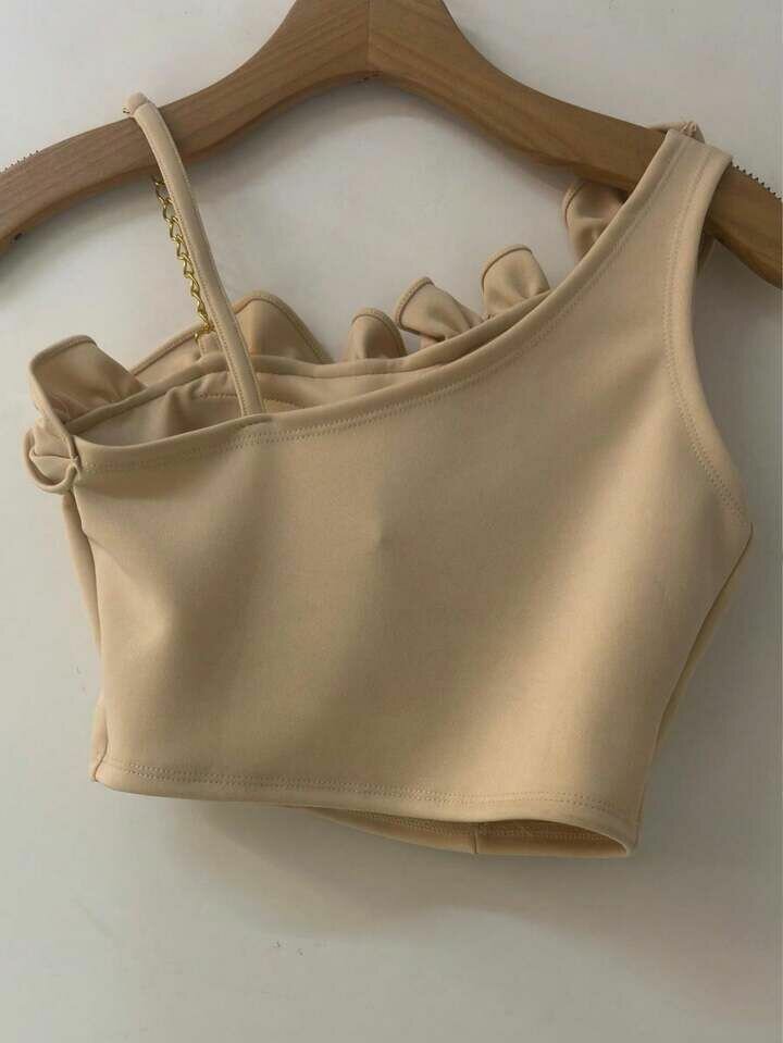 Ce top asymétrique beige avec volants est idéal pour un look élégant et tendance. Fabriqué en tissu de haute qualité, il est confortable et parfait pour les sorties estivales. Associez-le avec un jean ou une jupe pour un style chic et décontracté.