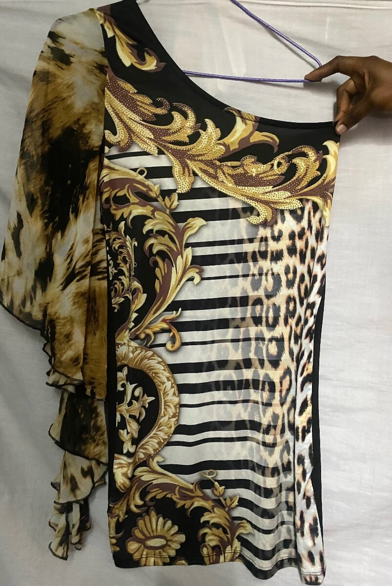 Ce top asymétrique audacieux est parfait pour un style unique. Avec son imprimé animal et ses volants, il est idéal pour les soirées ou les occasions spéciales. Confortable et chic, ajoutez une touche de glamour à votre garde-robe.