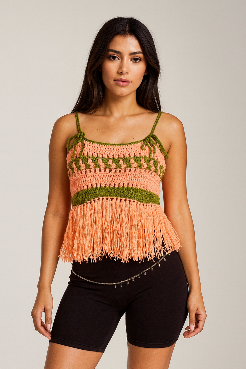 Craquez pour ce top crochet bicolore au style bohème avec ses franges exquises. Idéal pour un look estival décontracté, il se marie parfaitement avec un short ou une jupe. Confortable et léger, c'est le choix parfait pour les journées chaudes.