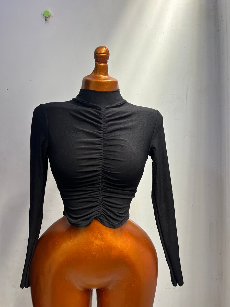 Ce top noir élégant à manches longues et longueur raccourcie est parfait pour un look moderne et tendance. Le design froncé ajoute une touche de sophistication, idéal pour sortir le soir ou pour un style décontracté chic. Facile à assortir avec des jeans ou des jupes.