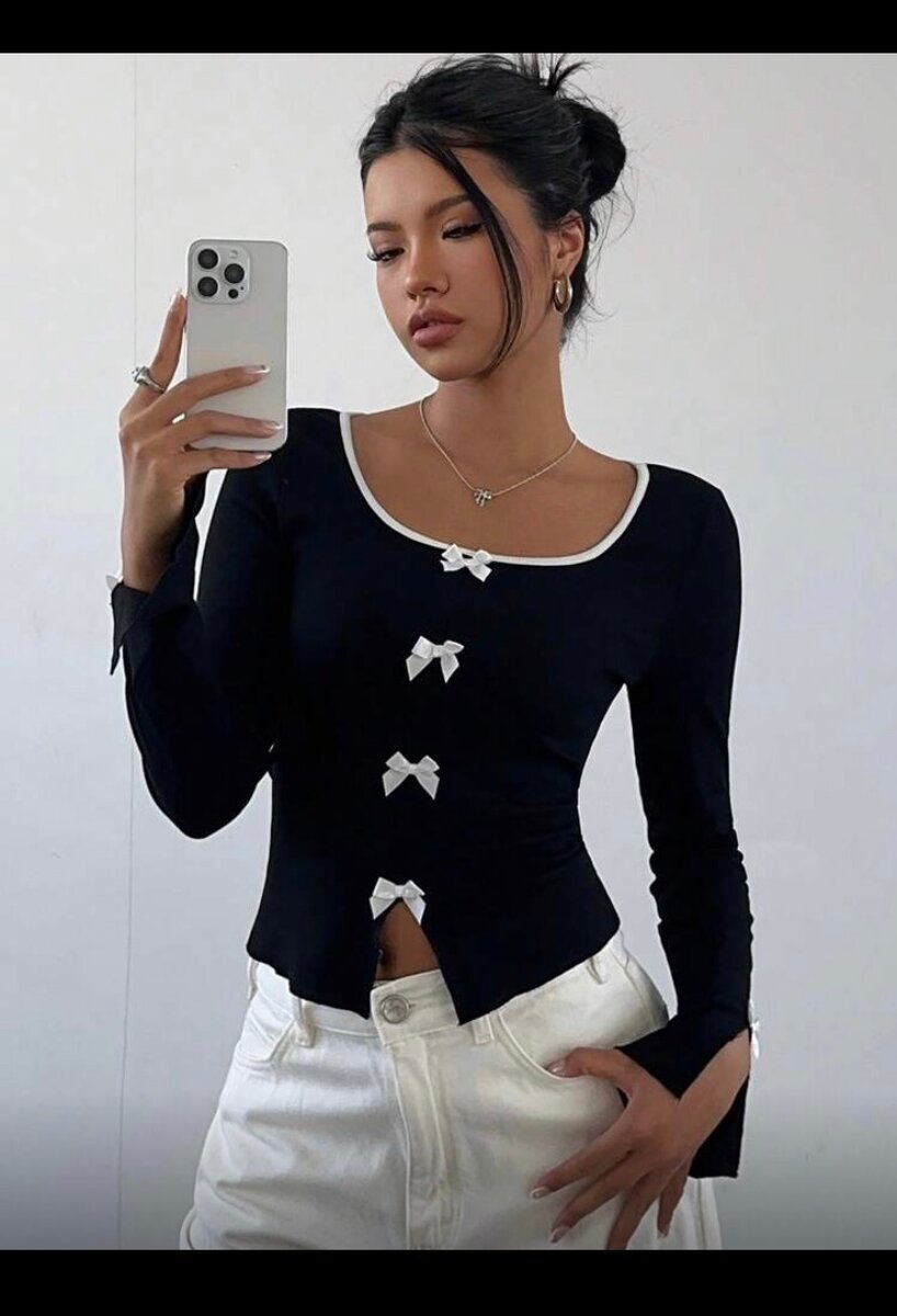 Découvrez ce top noir chic orné de jolis nœuds et à manches longues, idéal pour un look sophistiqué et moderne. Fabriqué dans un tissu confortable, il se marie parfaitement avec un jean ou une jupe pour toutes vos occasions.