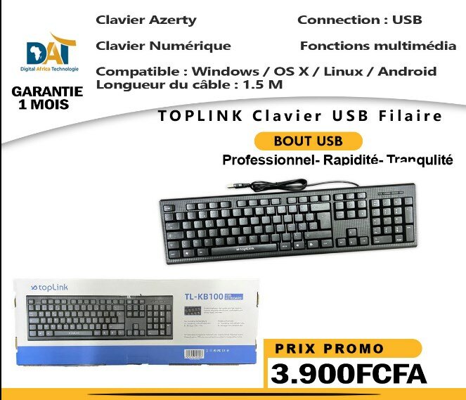 TOPLINK Clavier USB Filaire - TL-KB100 - Multimedia - Azerty - Numérique - Noir