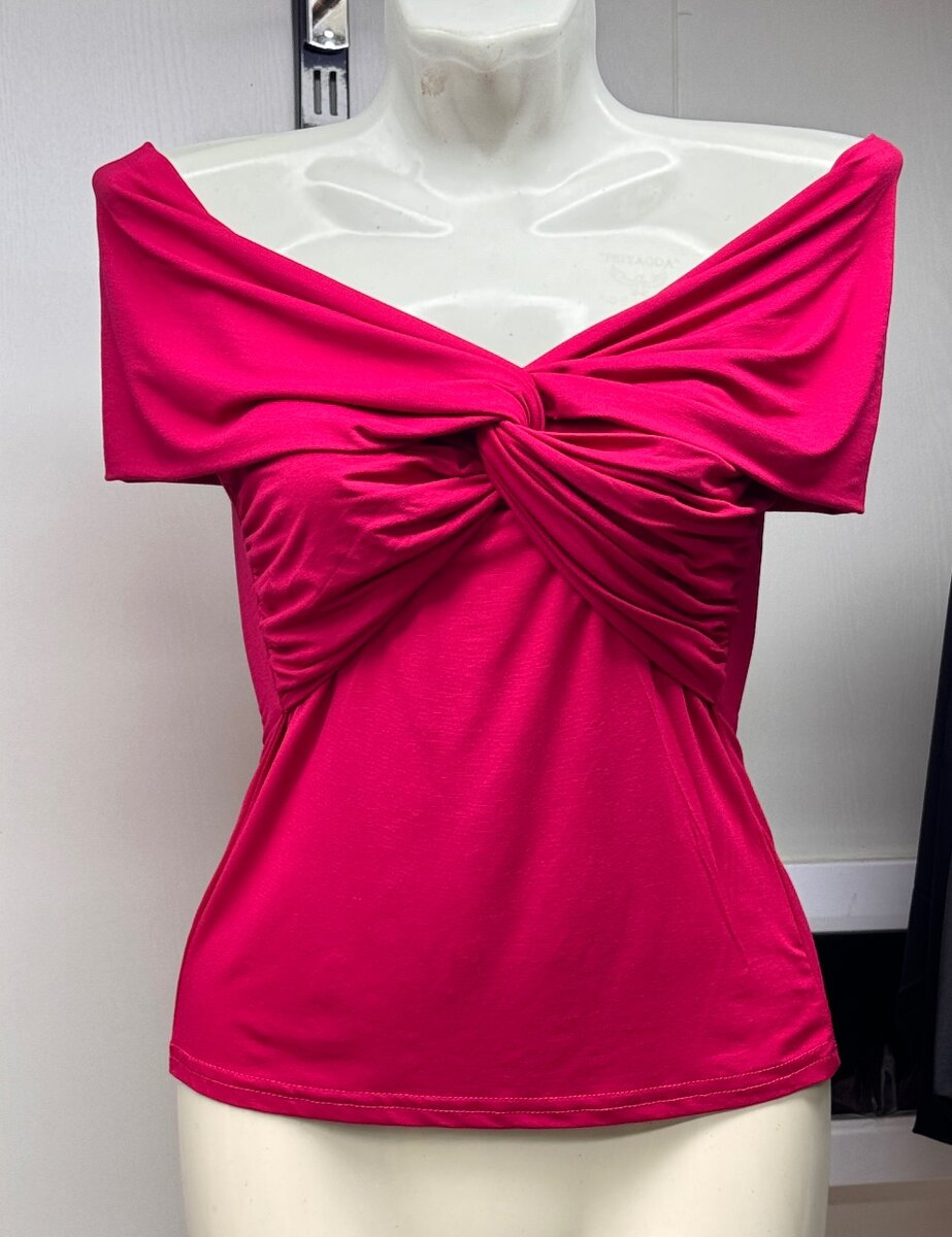 Малиновый топ с открытыми плечами и красивым узелом на груди. Приталенный крой подчеркивает фигуру. Идеально подходит для свиданий, праздников или вечерних образов. Размеры: S, M