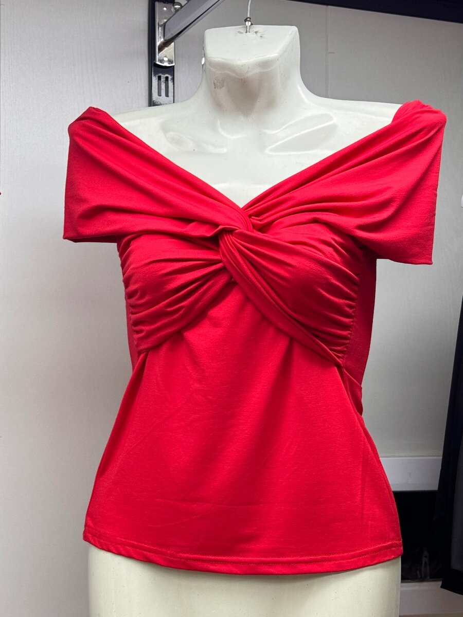 Красный топ с открытыми плечами и красивым узелом на груди. Приталенный крой подчеркивает фигуру. Идеально подходит для свиданий, праздников или вечерних образов. Размеры: S, M