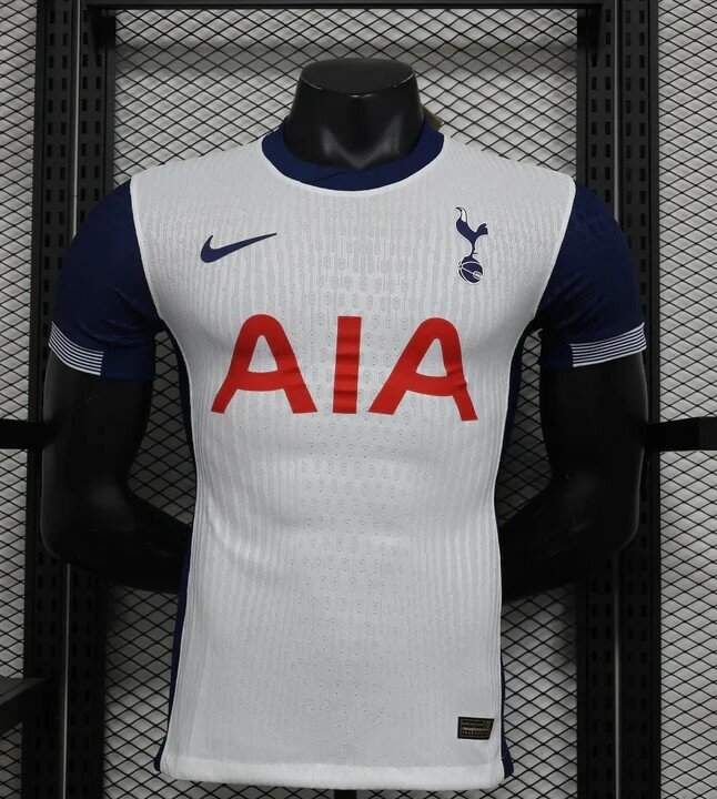 T-shirt à manches courtes du FC Tottenham pour la saison 2024-2025 à domicile, blanc avec des inserts bleus et avec un sponsor rouge sur la poitrine. La bordure sur le col et sur les épaules est de couleur bleue avec des inserts blancs. La poitrine est ornée de l'emblème du Club. Le t-shirt est fait d'un matériau de qualité qui possède une technologie qui évacue l'humidité et maintient le sec et le confort.