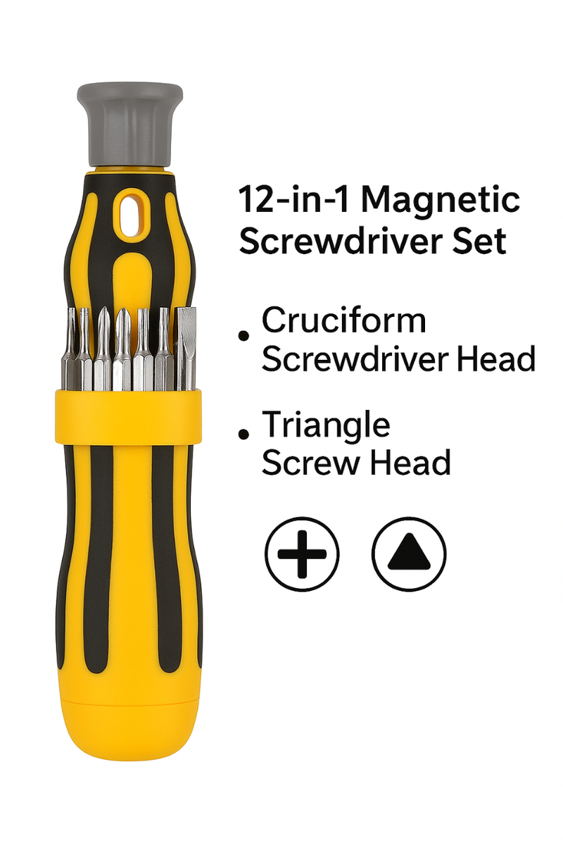 Améliorez votre coffre à outils avec ce set de tournevis magnétique 12-en-1. Parfait pour les réparations à domicile, ce produit est livré avec des embouts cruciformes et en triangle pour une polyvalence maximale. La poignée rotative ergonomique assure un confort d'utilisation optimal. Idéal pour les amateurs de bricolage et les professionnels.