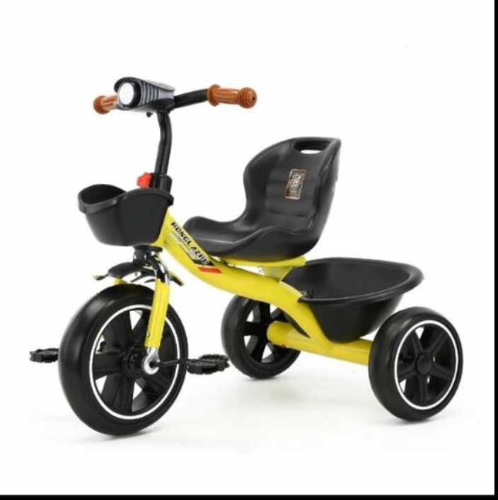 Tricycle évolutif pour enfant de 1 à 3 ans, cadre en métal jaune, siège confortable, panier avant, poignées en caoutchouc, roues en caoutchouc noir. Idéal pour les promenades et l'éveil de l'enfant.