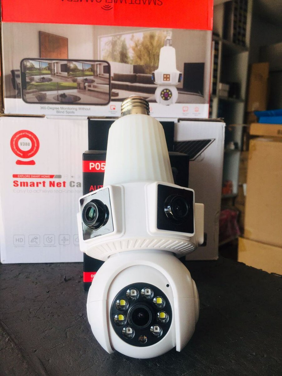 This is a triple Lens camera with 360 view . It's wifi and uses memory card for recording.