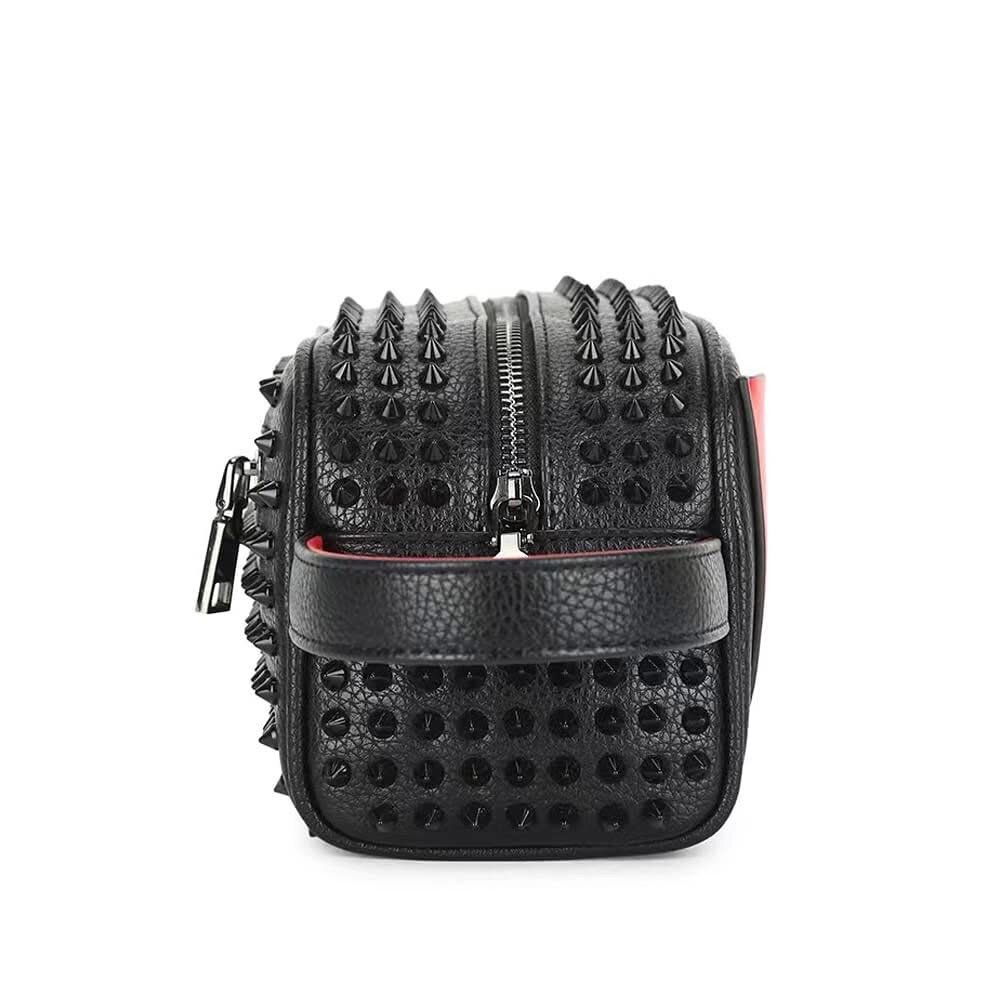 Adoptez un style audacieux avec cette trousse de toilette en cuir simili noir et rouge décorée de clous. Parfaite pour ranger vos essentiels de voyage avec une touche tendance. Idéale pour les déplacements ou comme cadeau unique.