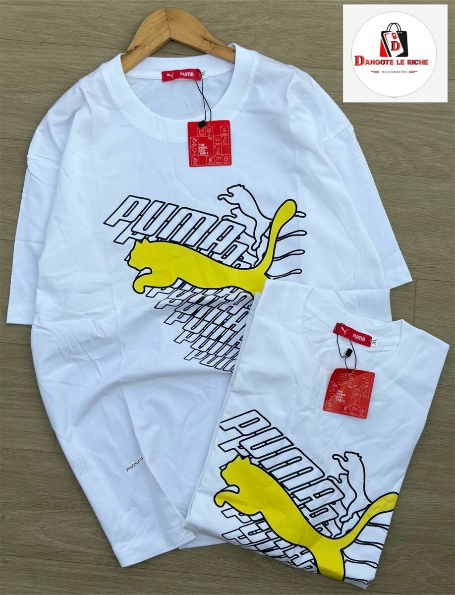 T-shirt blanc élégant avec logo Puma jaune vif. Fabriqué en coton doux pour un confort optimal, ce t-shirt est parfait pour un look décontracté et sportif. Idéal pour les fans de la marque.