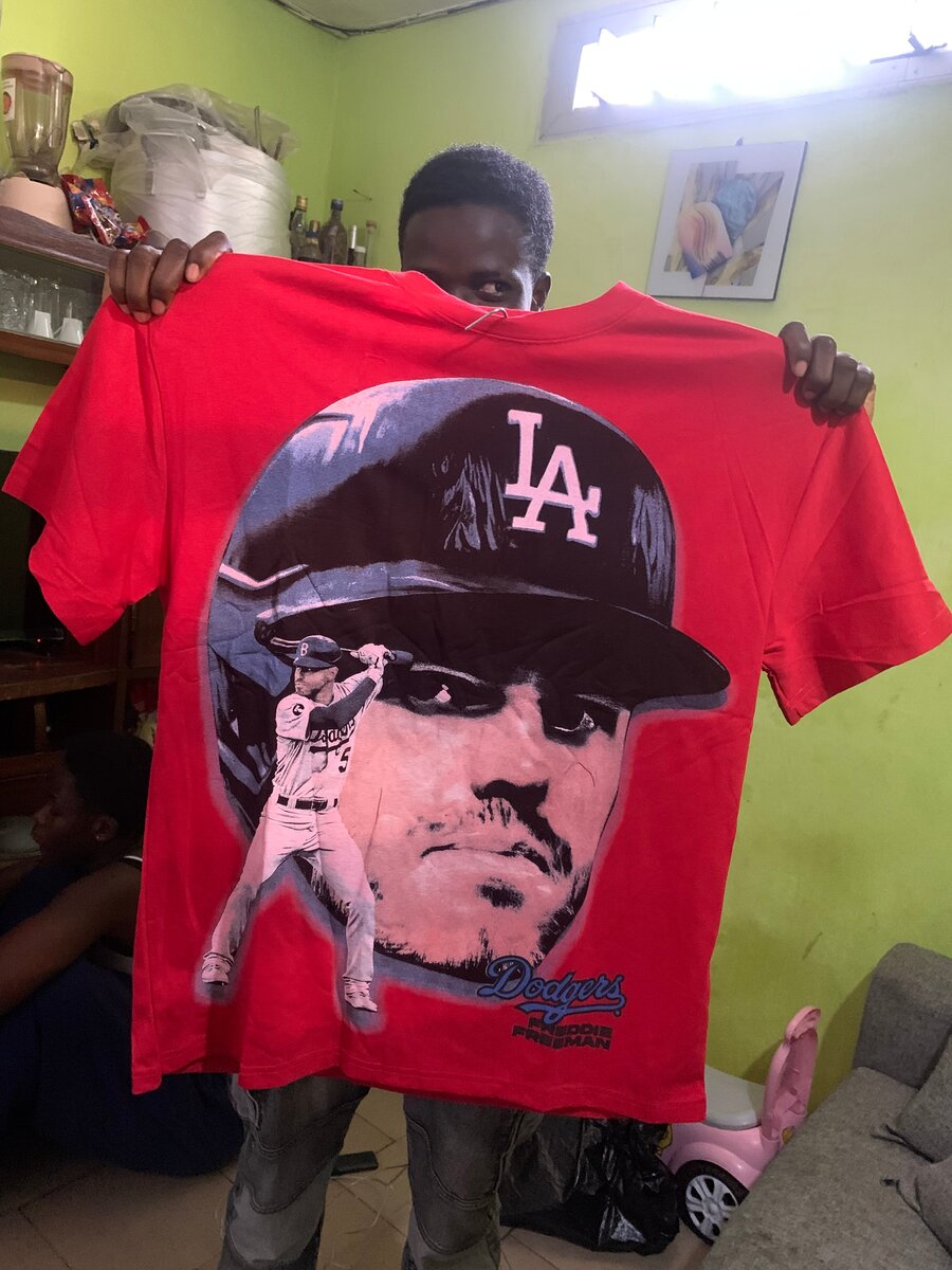 T-shirt homme avec impression La Dodgers, idéal pour les fans de baseball. Disponible en rouge et cyan. Confortable et stylé pour un look décontracté.