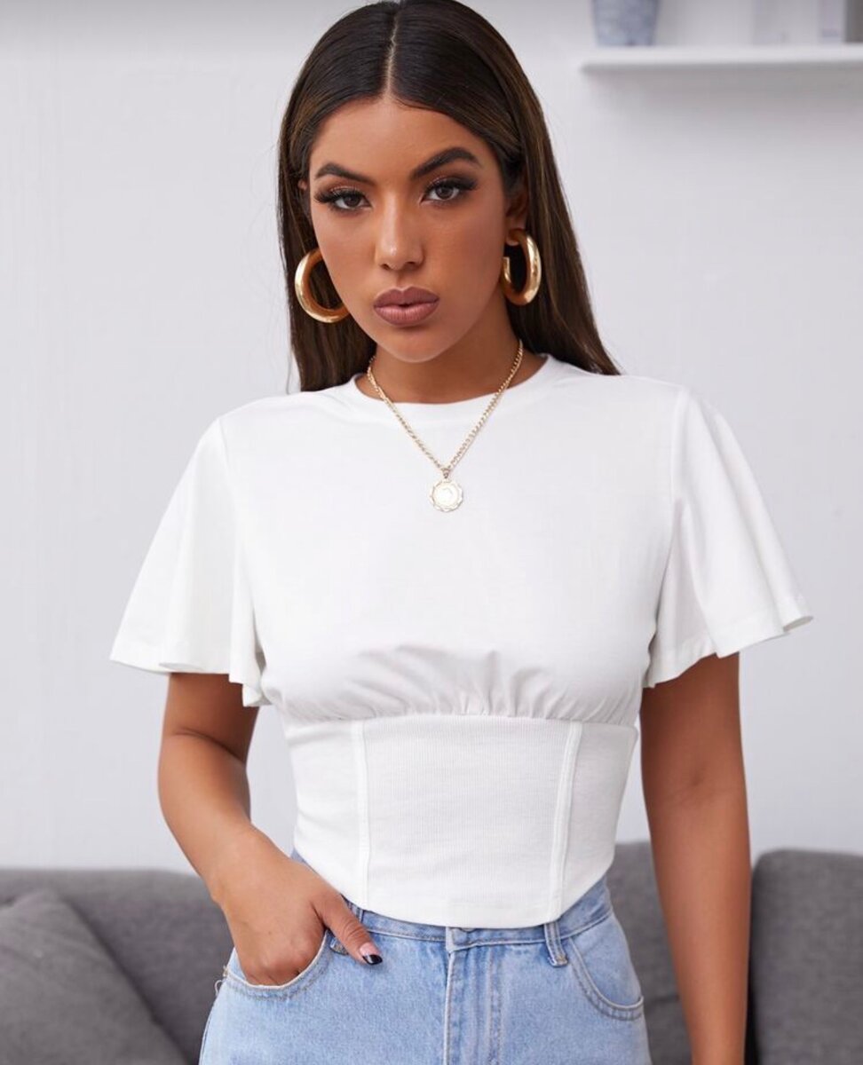 Découvrez notre t-shirt blanc élégant avec un détail de corset au niveau de la taille. Parfait pour ajouter une touche tendance à votre look quotidien, ce t-shirt est idéal pour un style à la fois décontracté et chic. Portez-le avec un jean pour une sortie entre amis ou habillez-le avec une jupe pour une occasion spéciale. Confortable et polyvalent, il deviendra un incontournable dans votre garde-robe.
