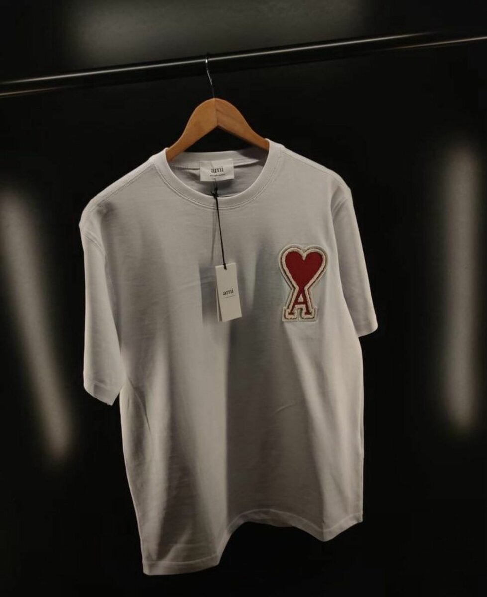 T-shirt blanc en coton avec un motif cœur et la lettre A. Conception simple et élégante, idéale pour un look casual. Disponible avec une étiquette.