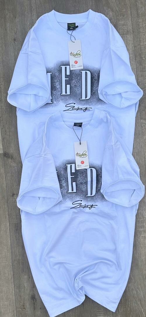 T-shirt blanc oversize avec impression graphique audacieuse pour un look moderne et tendance. Parfait pour un style décontracté et confortable. Disponible en plusieurs tailles.