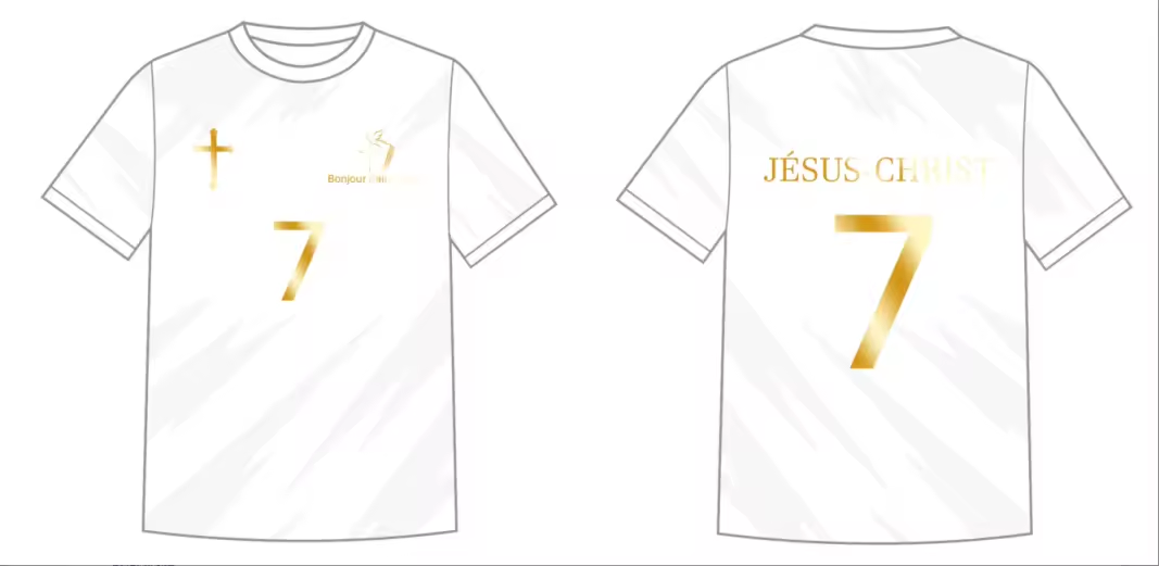 Ce t-shirt blanc élégant arbore un design doré unique avec l'inscription "Jésus Christ 7". Fabriqué en coton doux et confortable, il est parfait pour afficher un style décontracté et spirituel. Que ce soit pour des occasions spéciales ou au quotidien, ce t-shirt est un excellent choix pour exprimer votre foi et votre style. Disponible en plusieurs tailles pour convenir à tout le monde.