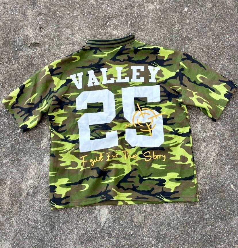T-shirt camouflage avec VALLEY 25 au dos, idéal pour les amateurs de mode streetwear et camouflage.
