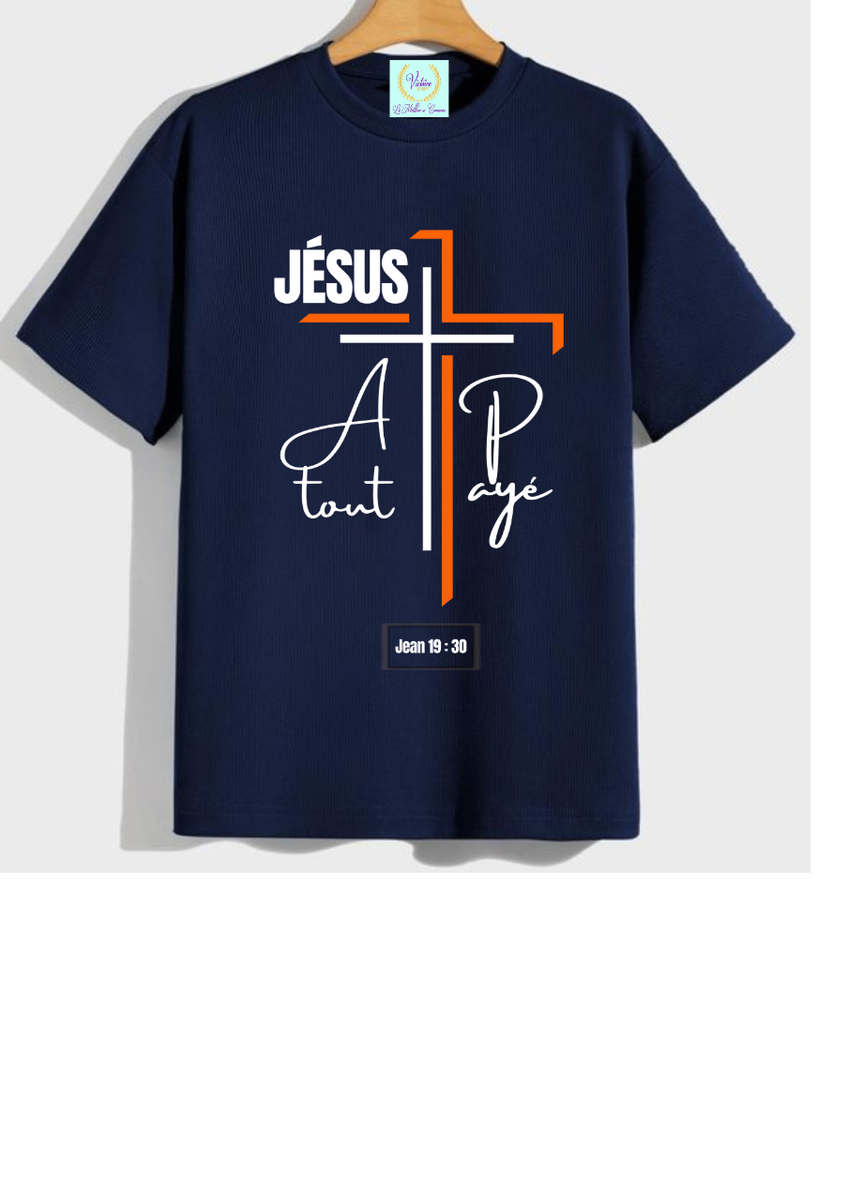 T-shirt chrétien avec motif de croix et citation biblique 'Jésus a tout payé' (Jean 19:30). Disponible en plusieurs couleurs.