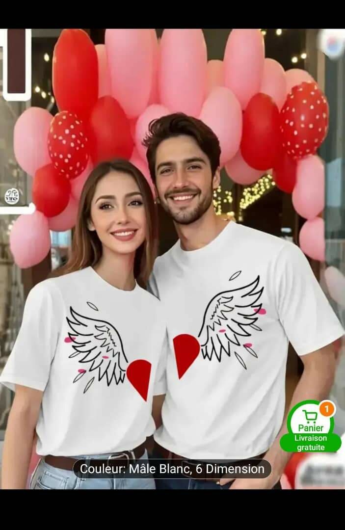 T-shirt pour les couples avec un design ailes et coeur rouge. Disponible en plusieurs tailles, idéal pour la Saint-Valentin ou pour afficher votre amour.