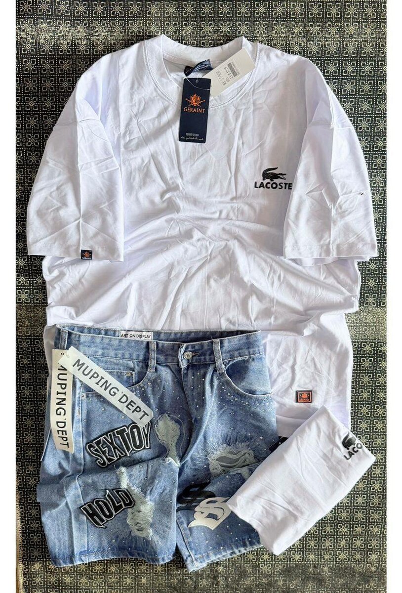 Optez pour un look casual chic avec cet ensemble t-shirt et short. Parfait pour les weekends et les sorties, ce lot offre confort et style avec des motifs tendance et des déchirures soignées. Idéal pour ceux qui aiment être à la mode tout en restant décontractés.