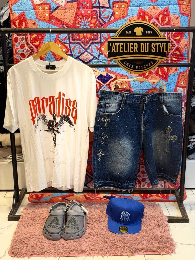 Parfait pour un style urbain et détendu, ce t-shirt imprimé "paradise" apporte une touche de personnalité à votre tenue. Associé à un short en jean avec motifs croisés, il offre un look moderne et confortable. Idéal pour une sortie en ville ou une journée décontractée. À combiner avec des sandales et une casquette pour compléter le style.