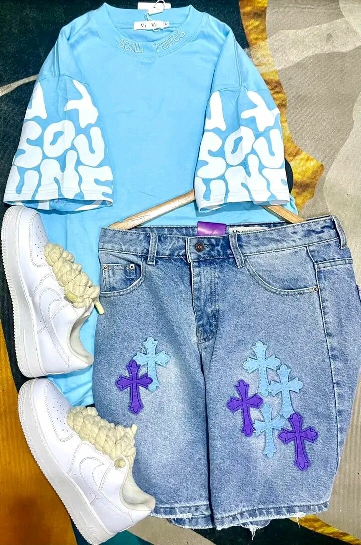 Exprimez votre style avec ce t-shirt bleu vibrant et short en jean. Parfait pour un look décontracté cet été. Idéal pour la plage ou une journée en ville. Confort et style réunis !