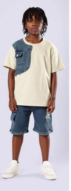 T-shirt pour garçon, confortable et élégant, combinant le coton beige avec des détails en denim.
