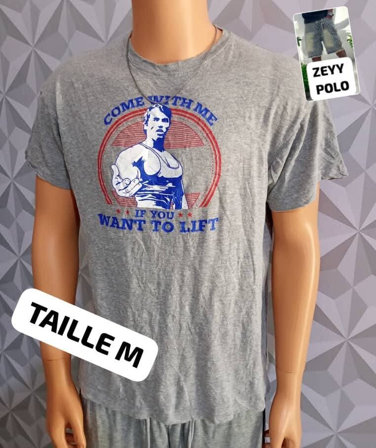 T-shirt gris décontracté pour homme, idéal pour la salle de sport ou le quotidien. Taille M, confortable et stylé avec un imprimé motivant. Parfait pour les amateurs de fitness.
