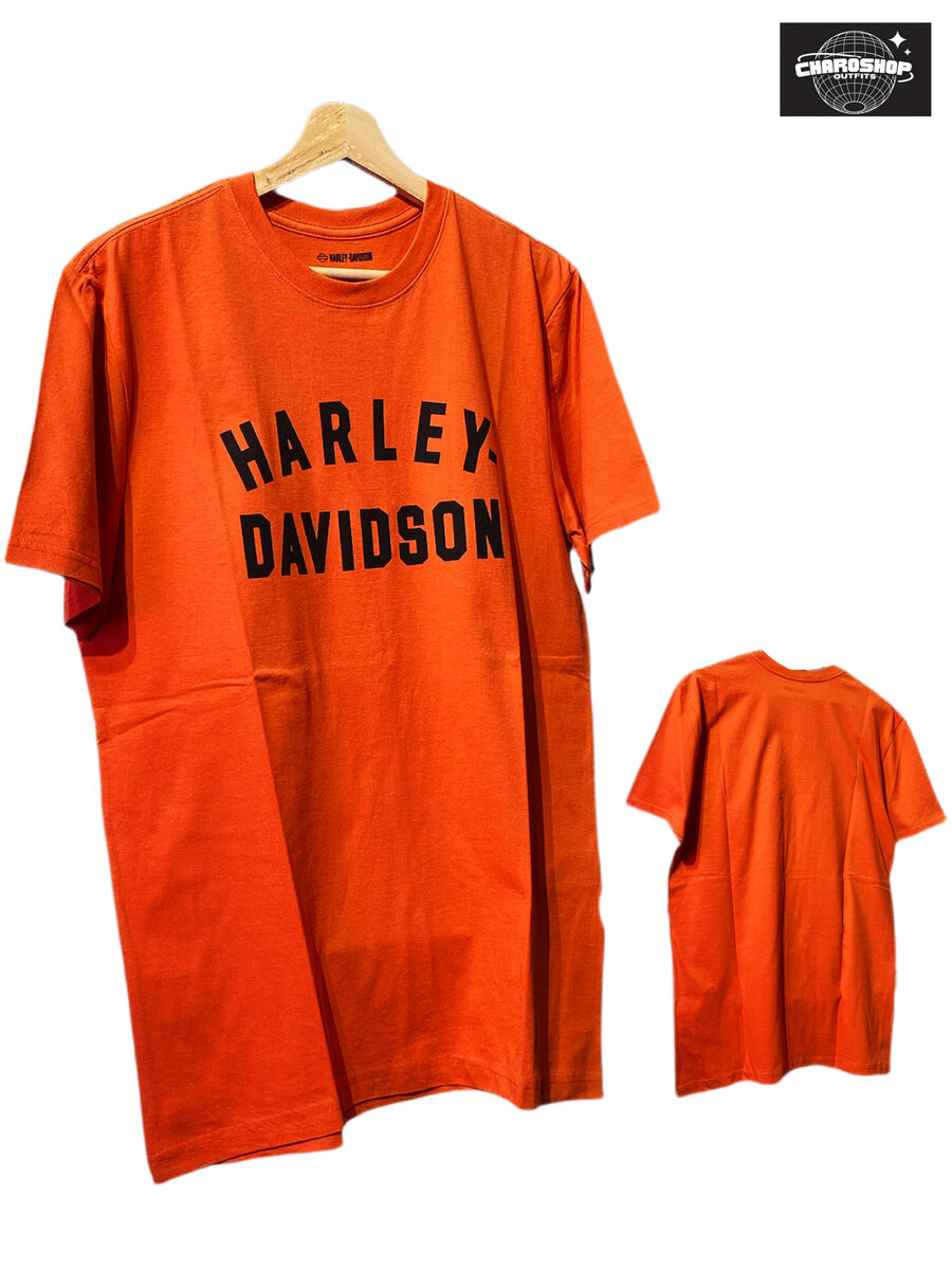 T-shirt Harley Davidson pour homme, couleur orange, confortable et idéal pour les amateurs de moto. Conçu pour les hommes qui aiment la liberté et l'aventure.