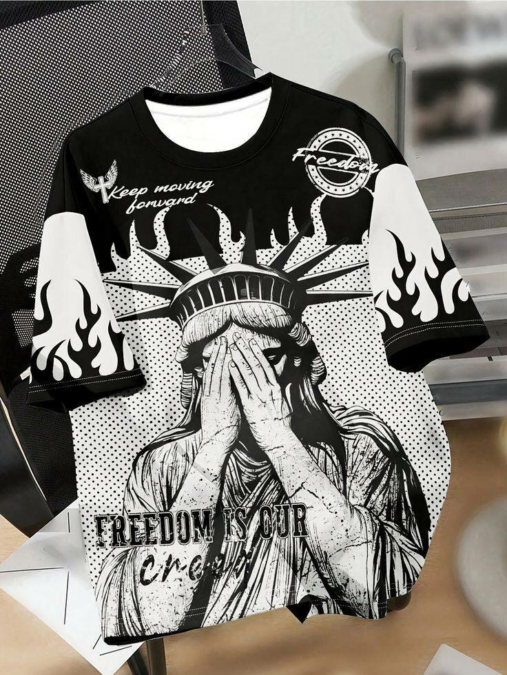 T-shirt homme noir avec imprimé Statue de la Liberté. Manches courtes, style streetwear. Idéal pour un look urbain et décontracté.