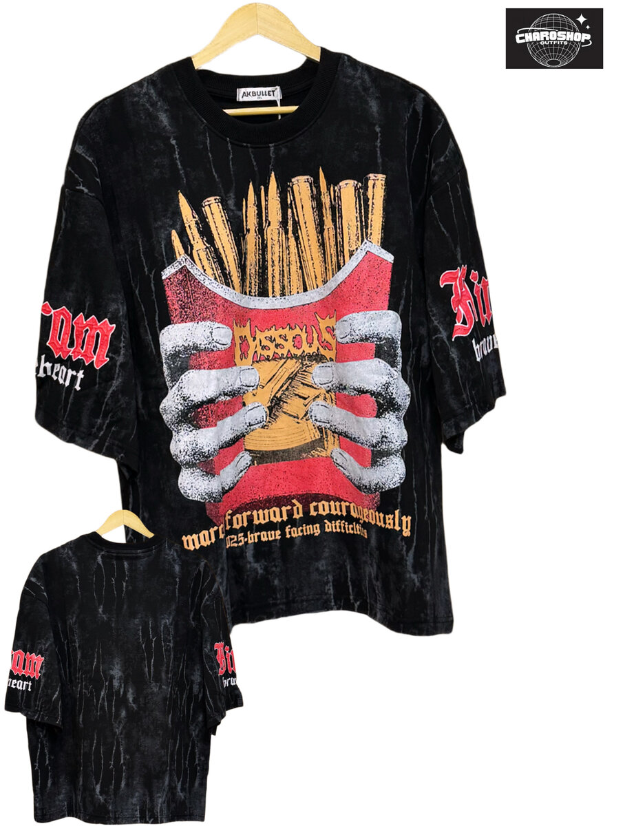 T-shirt noir oversize avec un design unique de frites et texte humoristique. Conçu pour les amateurs de streetwear.