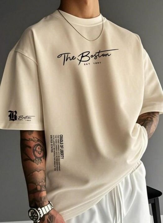 T-shirt en coton pour homme de couleur beige avec impression The Boston. Confortable et décontracté, idéal pour un usage quotidien.