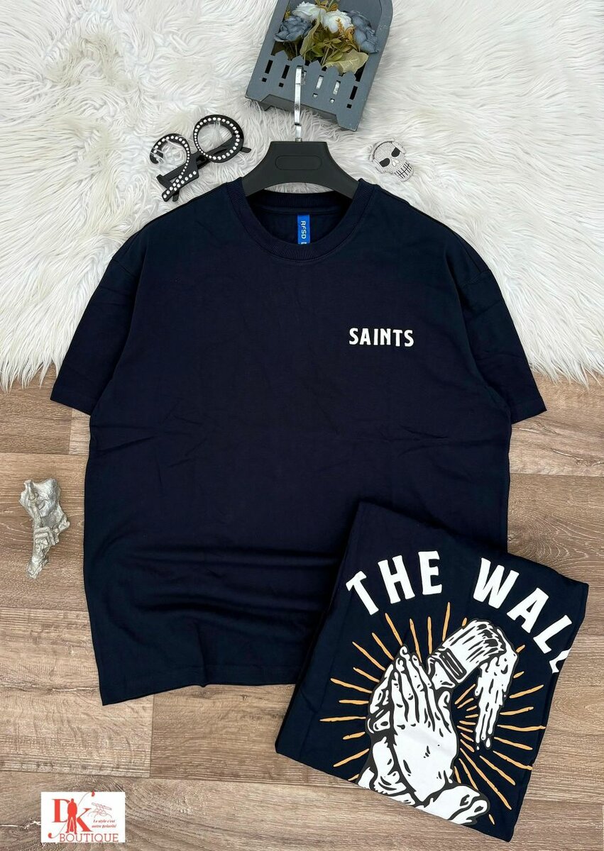 Optez pour ce T-shirt noir tendance avec imprimé "SAINTS" et design artistique au dos. Confortable et élégant, il est parfait pour un look décontracté. Idéal pour les sorties entre amis ou les journées détendues chez soi. Fabrication de qualité pour un port agréable toute la journée.