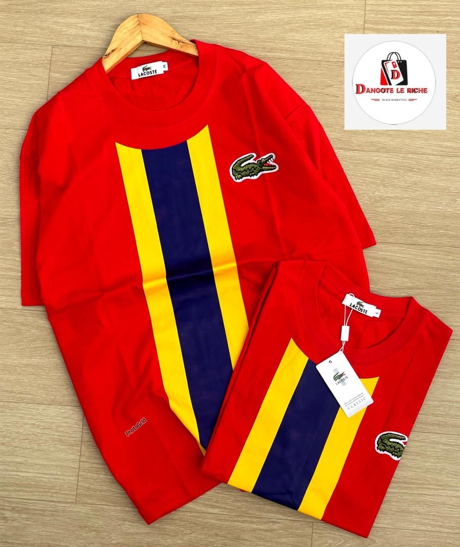 T-shirt Lacoste pour hommes de couleur rouge avec des rayures jaunes et bleues. Conçu pour le confort et le style, idéal pour les occasions décontractées et sportives.