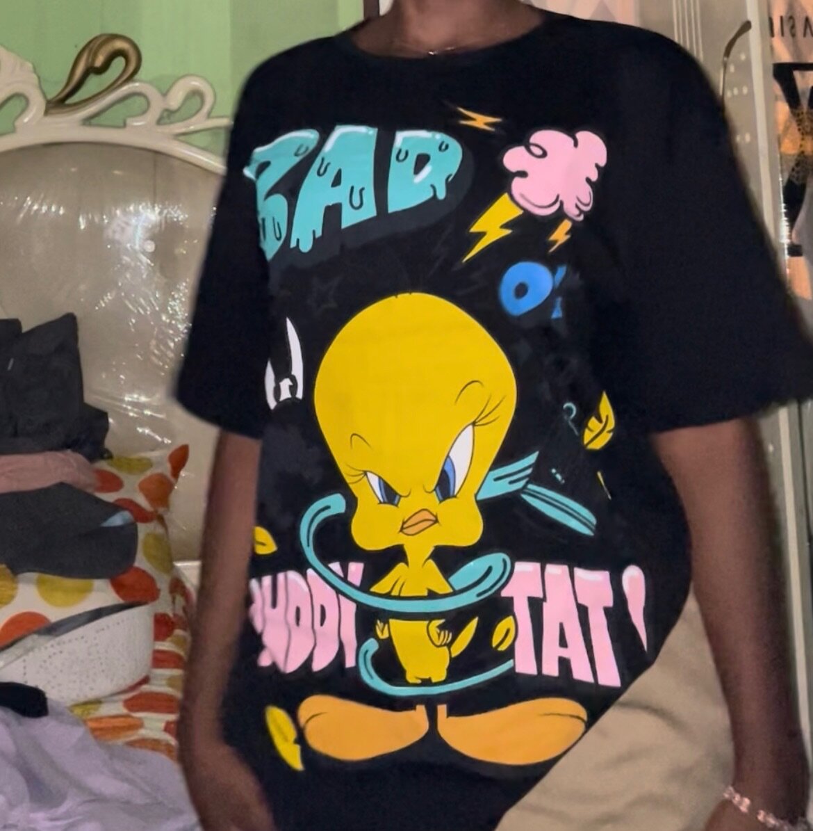 T-shirt noir tendance avec imprimé Tweety de Looney Tunes. Idéal pour les fans de dessins animés, offre un look décontracté et amusant. Disponible en différentes tailles pour un confort optimal. Parfait pour un style quotidien ou un cadeau unique.