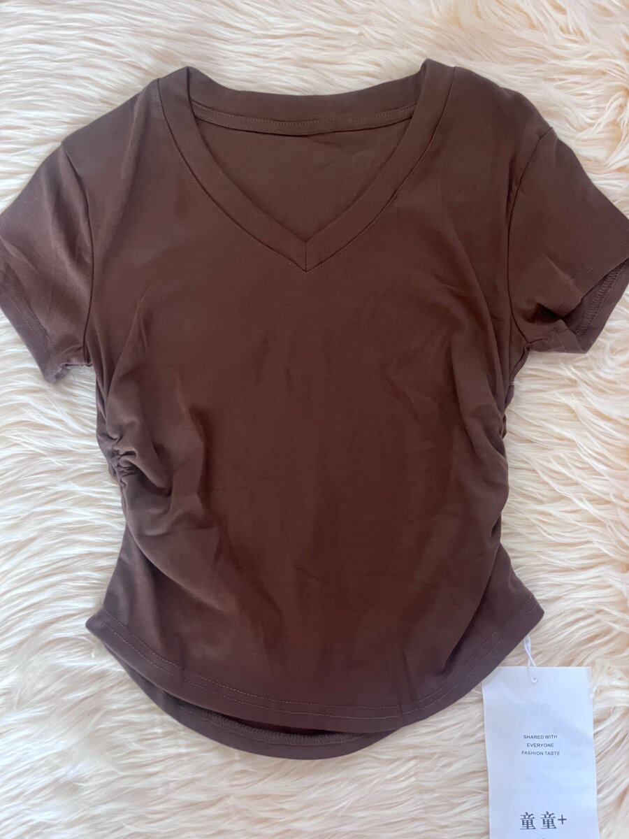 Découvrez notre T-shirt marron à col en V, parfait pour un look casual et stylé. Fait en coton doux, il offre un confort inégalé toute la journée. Idéal pour les sorties décontractées ou les journées de travail relaxantes. Sa coupe flatteuse s'adapte à toutes les silhouettes. Ne manquez pas ce basique indispensable à votre garde-robe!