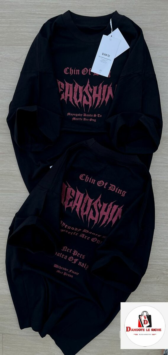 T-shirt noir élégant avec une impression graphique audacieuse en rouge. Parfait pour un style décontracté et tendance. Confortable et idéal pour un usage quotidien ou des sorties entre amis.