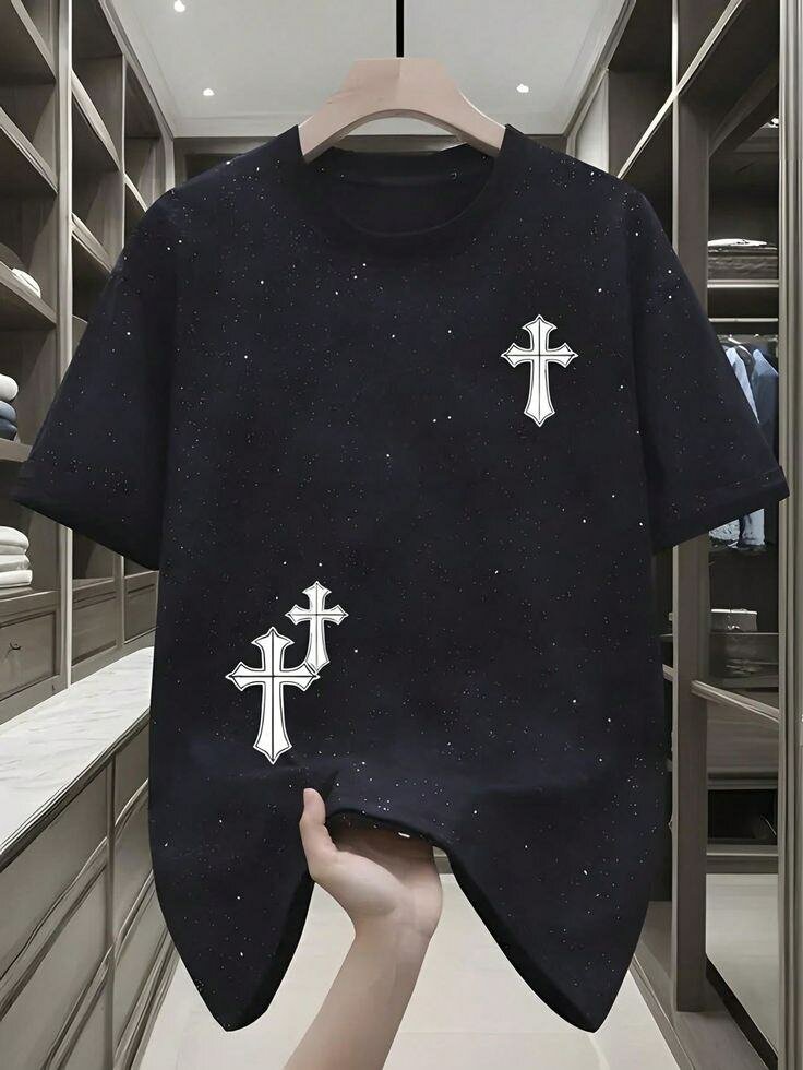 T-shirt noir élégant avec motifs de croix et paillettes pour un look tendance. Confortable et idéal pour les occasions décontractées.