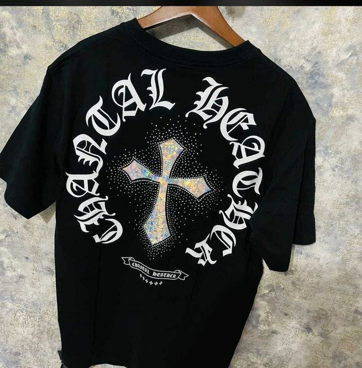 T-shirt noir à manches courtes avec impression graphique d'une croix et du texte 'Capital Head' en lettrage gothique. Conçu pour les amateurs de mode streetwear.