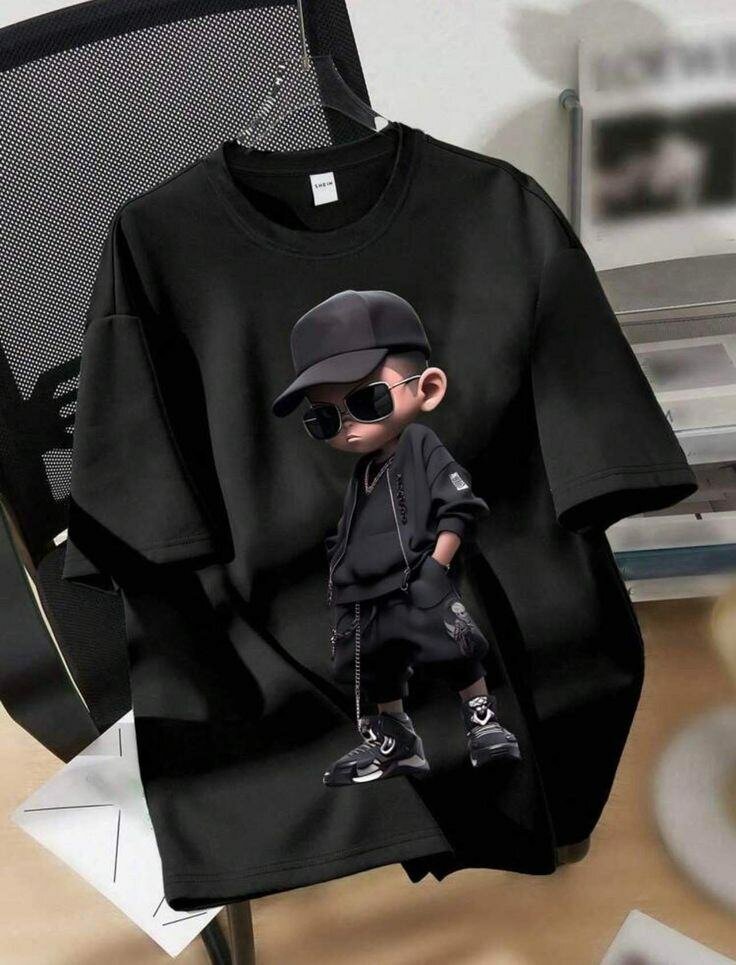 T-shirt noir pour hommes et garçons avec un imprimé graphique de garçon stylisé. Conçu pour un look décontracté et moderne. Idéal pour la vie quotidienne et les activités sportives.