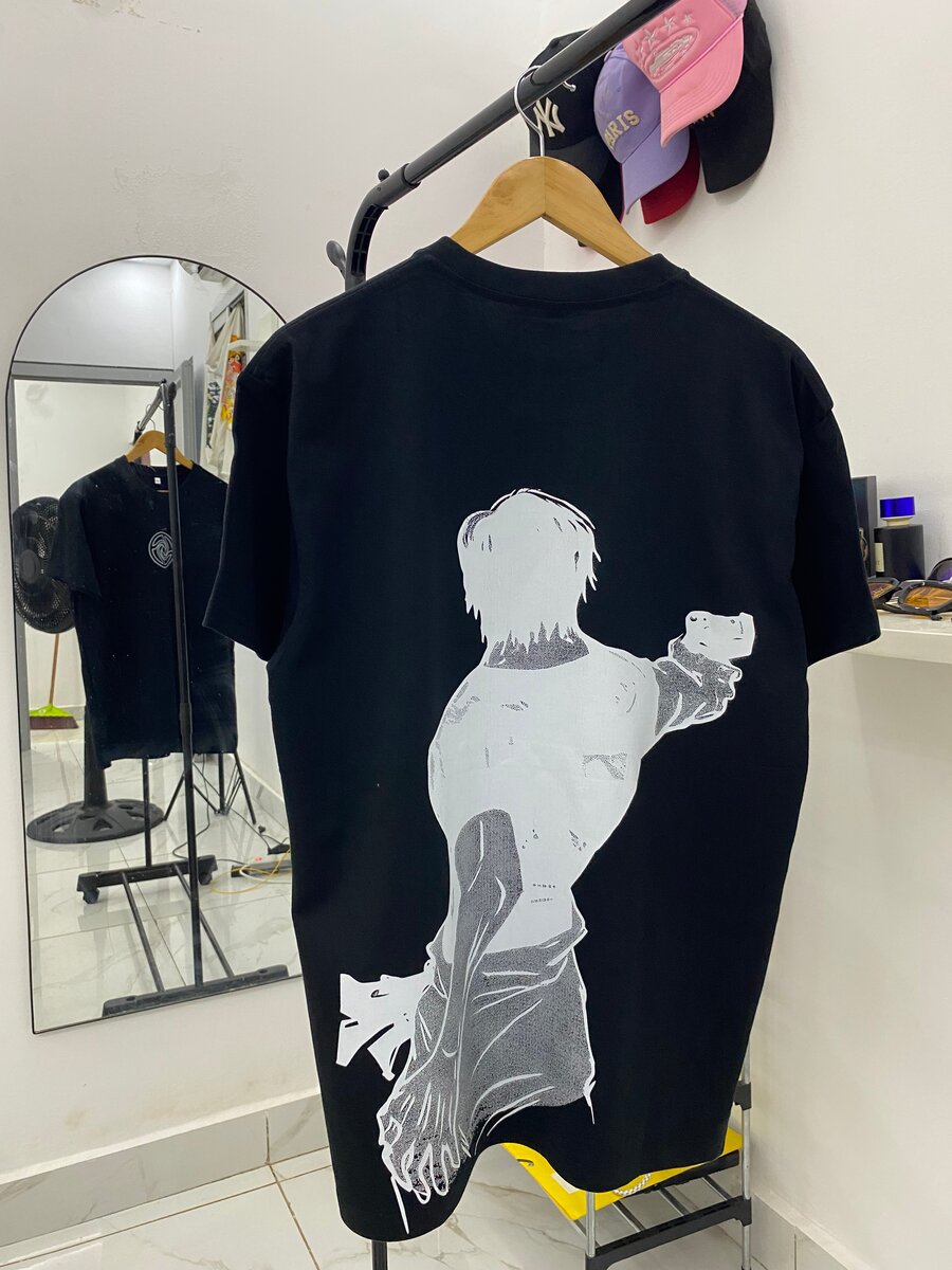 T-shirt noir pour homme avec un design graphique unique à l'avant et au dos. Conçu pour un look tendance et confortable. Idéal pour les amateurs de mode streetwear.