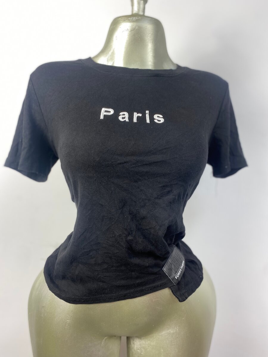 Découvrez ce t-shirt noir élégant arborant l'inscription "Paris" sur le devant. Conçu pour les femmes, il est parfait pour un style décontracté ou chic. Idéal pour une sortie entre amis ou une journée en ville. Faites l'expérience du confort grâce à son tissu doux et résistant. Un incontournable pour toute garde-robe moderne.