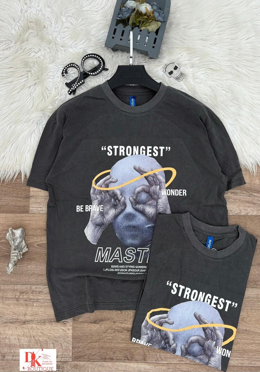 Portez la puissance avec ce T-shirt noir "Strongest". Fabriqué en coton doux, il offre un confort optimal. Idéal pour un look décontracté avec un message motivant. Parfait pour les amateurs de mode urbaine à la recherche de style et de confort.