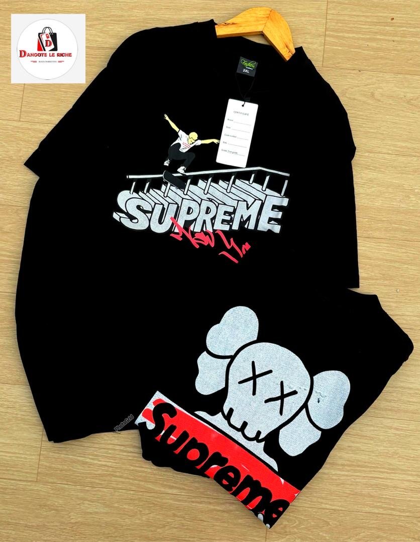 Découvrez ce t-shirt noir pour homme, inspiré des styles streetwear et graffiti. Conçu en coton de haute qualité, il est confortable et durable. Le design unique arbore des motifs 'Supreme' et 'Kaws', parfaits pour les amateurs de mode urbaine. Idéal pour un look décontracté et branché. Disponible en différentes tailles.