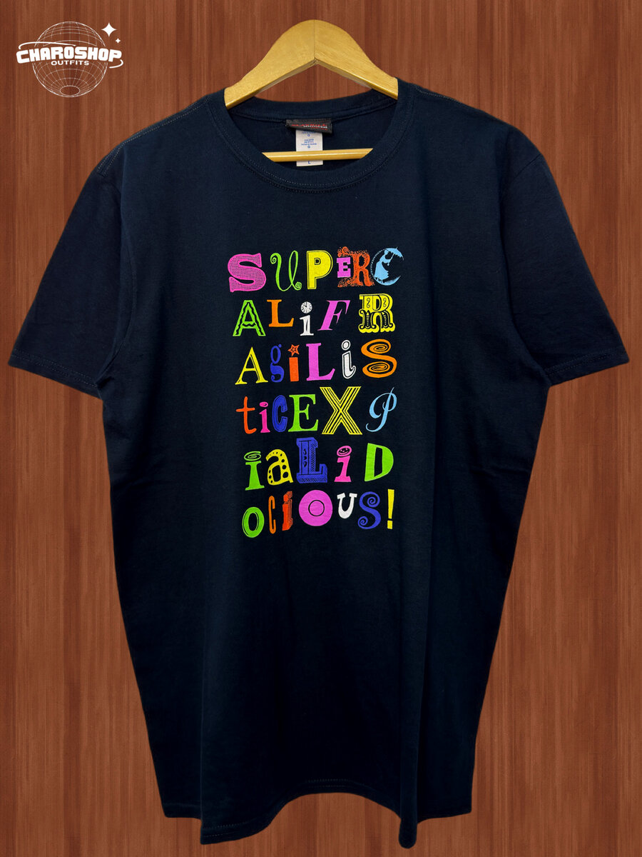 Adoptez un style unique avec ce t-shirt noir à imprimé coloré "Supercalifragilisticexpialidocious". Fabriqué en coton doux, il assure un confort optimal tout au long de la journée. Parfait pour les sorties casual ou pour ajouter une touche fun à votre garde-robe. Un indispensable pour ceux qui aiment se démarquer!