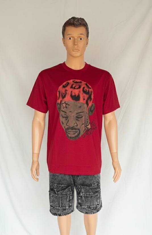 T-shirt rouge pour homme avec un design unique de visage et motif léopard. Idéal pour les amateurs de mode streetwear.