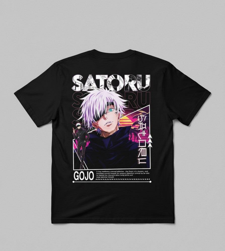 Découvrez le t-shirt Satoru Gojo de Jujutsu Kaisen, idéal pour les fans de l'anime. Conçu en noir avec une impression graphique de haute qualité, il met en avant le personnage emblématique Satoru Gojo. Un choix parfait pour un style unique et confortable.