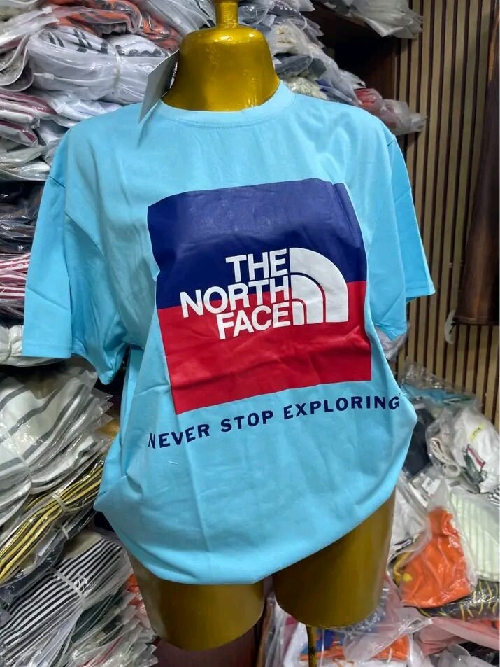 T-shirt bleu de la marque The North Face avec logo et slogan 'Never Stop Exploring'. Idéal pour les aventuriers et les amoureux de la nature.