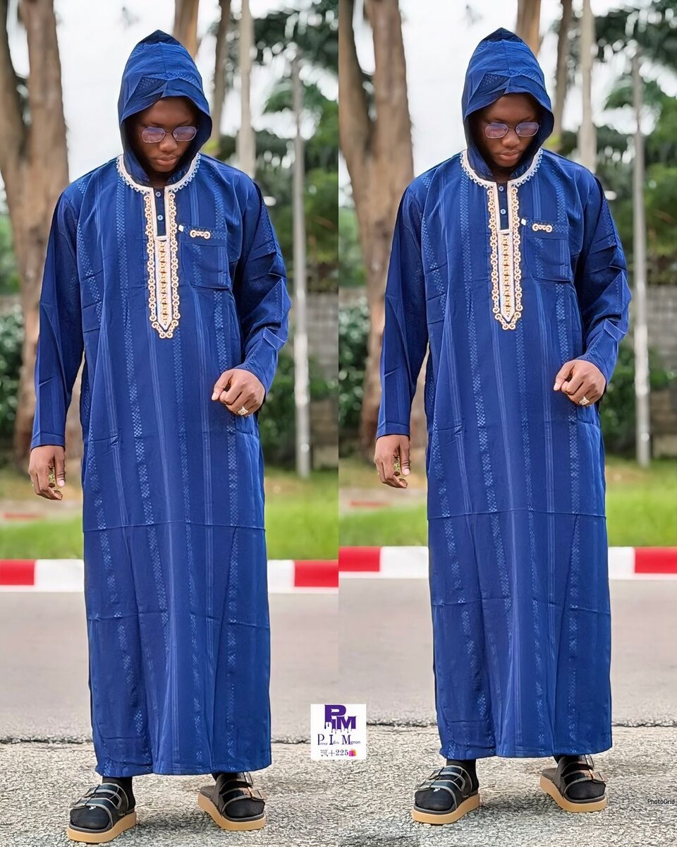 Tunique africaine pour homme, bleu avec capuche, idéale pour les occasions spéciales. Confortable et élégante.