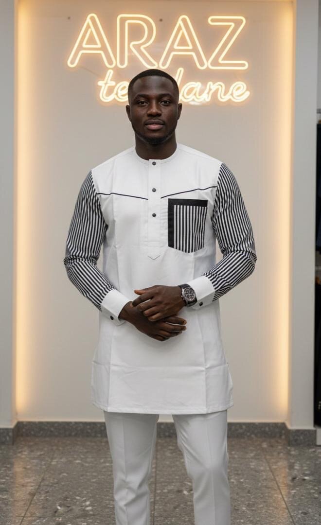 Découvrez une tunique africaine moderne avec des manches rayées contrastantes. Confectionnée pour allier style et confort, elle est parfaite pour des événements spéciaux ou un look décontracté chic. Choisissez cette pièce pour son design unique et sa polyvalence incomparable.